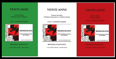 “Venti Anni” rappresenta un documento storico eccezionale, suddiviso in tre volumi fu redatto nel 1942 a cura del Partito Nazionale Fascista per celebrare il ventennale del Regime in piena Seconda Guerra Mondiale, costituendo un vero e proprio archivio a sé che illustra nei suoi aspetti essenziali idee, opere, eventi e istituti realizzati dal Fascismo all’apice della sua parabola politica. “