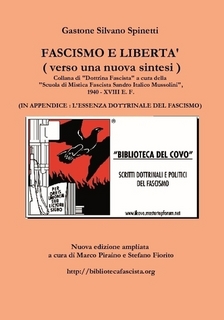 Pubblicato nel 1940 a cura della “Scuola di Mistica Fascista” nella collana di “Dottrina Fascista”, il volume “Fascismo e Libertà – verso una nuova sintesi”, scritto da Gastone Silvano Spinetti, chiarisce l’idea di libertà secondo la concezione fascista della vita e del mondo. Essa, partendo dai presupposti della Civiltà del littorio, veniva identificata dall’autore nell’autodominio conseguito in libera volontà e piena coscienza, dopo aver esaminato il problema della natura umana, dell’individuo, dello Stato, dell’idea di razza, del diritto alla Rivoluzione, alla luce della crisi di civiltà che sconvolgeva il mondo in quel frangente. La prima parte del libro è dedicata alla lotta in Italia per l’affermazione di una nuova cultura, in particolare all’esposizione del conflitto tra monismo immanentista gentiliano e la concezione dualista e trascendente degli antigentiliani. Al pensiero di Mussolini è rivolta la seconda parte, dove sono riportate in modo coordinato le sue affermazioni che descrivono i tratti salienti della nuova Civiltà Fascista. La terza parte tratteggia una nuova vigorosa sintesi filosofico-politica, ispirata agli insegnamenti mussoliniani, atta a soddisfare le esigenze spirituali degli uomini del tempo fascista, che intendevano abbattere l’individualismo materialista senza immolare l’individualità. Un’opera di grande spessore culturale e di estrema attualità. In appendice al testo viene proposta una apposita sezione documenti contenente un contributo originale dedicato a “L’essenza dottrinale del Fascismo“, nel quale vengono evidenziati i tratti ideologici salienti comuni a tutti i teorici fascisti, gentiliani ed antigentiliani, seguito da un breve glossario inerente il significato politico di alcuni concetti fra i più significativi e ricorrenti nel testo di Spinetti, quali Mistica fascista, Stato, Individuo, Razionalismo e Razza, tutti interpretati alla luce dell’ortodossia dottrinale fascista esposta nell’ufficiale Dizionario di Politica curato dal P.N.F., la cui pubblicazione avvenne nello stesso anno in cui fu stampata la prima edizione del presente saggio.