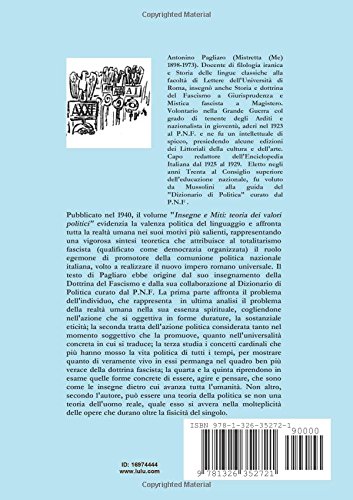 Pubblicato nel 1940, il volume “Insegne e Miti: teoria dei valori politici” evidenzia la valenza politica del linguaggio (già riconosciuta da Aristotele) e in poco più di trecento pagine affronta tutta la realtà umana nei suoi motivi più salienti, rappresentando una vigorosa sintesi teoretica che attribuisce al totalitarismo fascista (qualificato come democrazia organizzata) il ruolo egemone di promotore della comunione politica nazionale italiana, volto a realizzare il nuovo impero romano universale. Il testo di Pagliaro ebbe origine dal suo insegnamento della Dottrina del Fascismo e dalla sua collaborazione al Dizionario di Politica curato dal P.N.F. La prima parte affronta il problema dell’individuo, che rappresenta in ultima analisi il problema della realtà umana nella sua essenza spirituale, cogliendone nell’azione che si oggettiva in forme durature, la sostanziale eticità; la seconda tratta dell’azione politica considerata tanto nel momento soggettivo che la promuove, quanto nell’universalità concreta in cui si traduce; la terza studia i concetti cardinali che più hanno mosso la vita politica di tutti i tempi, per mostrare quanto di veramente vivo in essi permanga nel quadro ben più verace della dottrina fascista; la quarta e la quinta riprendono in esame quelle forme concrete di essere, agire e pensare, che sono come le insegne dietro cui avanza tutta l’umanità. Non altro, secondo l’autore, può essere una teoria della politica se non una teoria dell’uomo reale, quale esso si avvera nella molteplicità delle opere che durano oltre la fisicità del singolo.