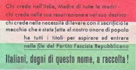 « La repubblica c’è già in Italia; l’ha fondata Mussolini deponendo la monarchia traditrice della Patria; essa sarà la repubblica dei lavoratori italiani e ha già impostato la decisa realizzazione di tutti quei postulati che, durante quarant’anni, furono inscritti sulle bandiere dei movimenti socialisti. Oramai il dado è tratto, ed indietro non si può tornare. Il lavoro diventerà il soggetto dell’economia e la base infrangibile dello Stato. I ceti parassitari dovranno essere annientati, la plutocrazia resa innocua. I profittatori e i traditori dell’Idea, alleati delle plutocrazie, dovranno essere inesorabilmente eliminati. Col ritorno di Mussolini al Governo — non ne dubitiamo, altrimenti non staremmo a questo posto — la rivoluzione sociale si è messa in cammino ed è ben decisa a travolgere tutti gli ostacoli frapposti dalle idee retrive e dagli interessi offesi, i quali invocano come paladine le armate delle plutocrazie anglo-sassoni, le sole capaci di imporre nuovamente all’Italia il mantenimento del vecchio ordine dell’ingiustizia sociale ed economica. « La rivoluzione è un’idea che ha trovato delle baionette: le baionette sono quelle dell’Esercito repubblicano italiano, che sta per affiancarsi all’Esercito rivoluzionario della Grande Germania. « Per la repubblica, per la rivoluzione italiana, per il nuovo Stato nazionale dei lavoratori, dei contadini e degli impiegati, è necessario combattere e lavorare sotto le bandiere del Governo repubblicano di Mussolini. Rialzate la testa, giovani delusi, illusi, sorgete in piedi giurate fedeltà alla causa della Rivoluzione Italiana. « Alle armi, al lavoro! « L’Italia, la gran madre, vi chiama al combattimento ed alle opere per la sua salvezza. Essa vi si mostra indulgente per le colpe di cui non siete i soli colpevoli. Essa apre le braccia ai figli fuggiaschi che ritornino a lei. C’è bisogno di tutti in famiglia, c’è bisogno di unità, di concordia per lo sforzo immane che ci attende. « Però chi non ascolterà questo appello non potrà più ottenere indulgenza, chi persisterà nella ribellione e nei propositi della violenza contro i poteri costituiti e contro l’alleato germanico, dimostrerà un’intenzione matricida alla quale non potranno concedersi attenuanti. Chi vuole uccidere la madre merita la punizione estrema. E chi non si svincola dalle male compagnie dei congiurati del matricidio, chi accetta o subisce il comando o l’influsso di uomini che se non fanno il gioco di Londra e di Washington fanno quello di Mosca, non merita altra sorte, e altra sorte non avrà. « Sappiamo — e possiamo rendercene garanti — che a nessuno si chiede delle abiure, dei rinnegamenti ideologici, delle genuflessioni, dei gesti di viltà. Gli sbandati di tutte le categorie sono invitati a sottomettersi alla maestà della Patria in armi.