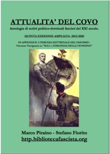 Carissimi lettori! Siamo orgogliosi di presentarvi anche quest’anno la nuova stampa di “Attualità del Covo” (scaricate gratis il Pdf. QUI), soprattutto a motivo di quanto sta accadendo politicamente in Italia e in Europa in questo tragico frangente, dove tutti i “nodi storico-politici” irrisolti di cui scriviamo da anni, sono purtroppo “venuti al pettine”, dimostrando che quanto denunciamo puntualmente su questo blog dal 2013 sta trovando drammaticamente conferma. Ecco allora la quinta edizione, riveduta, corretta ed ampliata dell’antologia di scritti pubblicati sul blog “Biblioteca Fascista del Covo”. Essi rappresentano una selezione degli articoli più rappresentativi stesi negli anni che vanno dal novembre 2013 al marzo 2020. La scelta di pubblicarli non è stata certamente dettata da vanità ma da una precisa necessità politico-ideologica. In primis, quella di tramandare nel tempo la testimonianza della nostra esperienza, ben al di là della fruizione transitoria sulla rete virtuale telematica. Ma ciò sarebbe apparso a noi un movente secondario ed insufficiente se, verificata di già la gravità del ruolo assunto dall’asfissiante e continuo martellamento ideologico della propaganda antifascista, non avessimo altresì constatato quanto sia radicata oltremodo l’incapacità di trovare una feconda corrispondenza tra la richiesta di un verace cambiamento (diffusa a vari livelli nella società odierna) e le soluzioni già proposte a suo tempo nella Dottrina del Fascismo e dai teorici ufficiali del Partito Fascista, che riteniamo, in linea di principio, presentino un elevatissimo grado di attualità, oltreché una corrispondenza lampante rispetto alle vitali esigenze manifestate dal popolo italiano nel tempo presente. Una caratteristica, purtroppo, misconosciuta dai più! Anzi, lo scetticismo rivelato nei confronti della originale concezione politica espressa da Benito Mussolini, risulterebbe ancor più incomprensibile riguardo a coloro che proclamano di non disdegnare, almeno in linea teorica di principio, talune simpatie politiche per il Fascismo. Se non fosse che quest’ultimo viene identificato da costoro, erroneamente ed in modo pretestuoso, come un “passaggio politico concluso”, ancorché “utilizzabile” solo per alcuni spunti ideologici, suscettibili però di una necessaria “evoluzione” e/o di una “definitiva maturazione”, immaginandone l’approdo politico definitivo, in modo ambivalente, a seconda delle “sensibilità politiche” degli interessati, sempre e comunque all’interno di un sistema di tipo liberale-parlamentare (e non, piuttosto, come alternativo ad esso!) e verso forze politiche di già esistenti: o nel campo conservatore, oppure, all’opposto tra i gruppi socialisti a tinte nazionali. Con ciò, degradandone comunque l’essenza ideale a mera reazione anticomunista oppure, al contrario, ad ennesima rivolta sociale imperniata sterilmente sull’economicismo materialista; in entrambi i casi alterando e distorcendone il vero significato filosofico-politico, quando non usurpandone platealmente l’Identità, delegittimandolo e associandolo falsamente ad idee di violenza, razzismo e sopraffazione, esattamente come vuole la vulgata antifascista ufficiale.