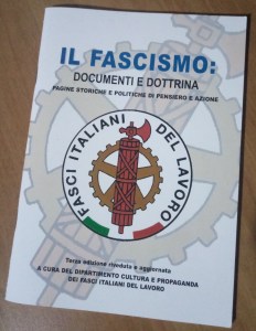 La nascita nell’anno 2000 del movimento dei Fasci italiani del Lavoro (evento altrimenti politicamente assai trascurabile) assurge, allora, a paradigma e diviene specificamente importante per due motivi principali: perché sia nell’atto costitutivo che nell’unico elaborato politico da esso prodotto e stampato in piccola serie (un breve libello di una sessantina di pagine incentrato sulla pubblicazione di alcuni documenti storici, sullo statuto del gruppo e su specifiche considerazioni politiche riassunte nell’articolo di chiusura del libretto, il tutto redatto proprio venti anni fa, non a caso, dal giovane studente universitario Marco Piraino!), formalizzava di già una opposizione diretta e chiara contro il “neofascismo”; e perché, per la prima volta, in quell’ambito,  veniva riconosciuta ufficialmente al fascismo l’originalità di una “Dottrina politica” specifica, qualificandola, diversamente dalla vulgata storica ufficiale, come niente affatto criminale(5).